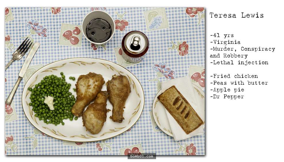 ▼Teresa Lewis,41岁,来自美国维吉尼亚州,因谋杀和抢劫被判死刑。最后一餐的食物他要求炸鸡,奶油豌豆,苹果派和Dr Pepper饮料一罐(Dr Pepper是美国著名的饮料公司)。