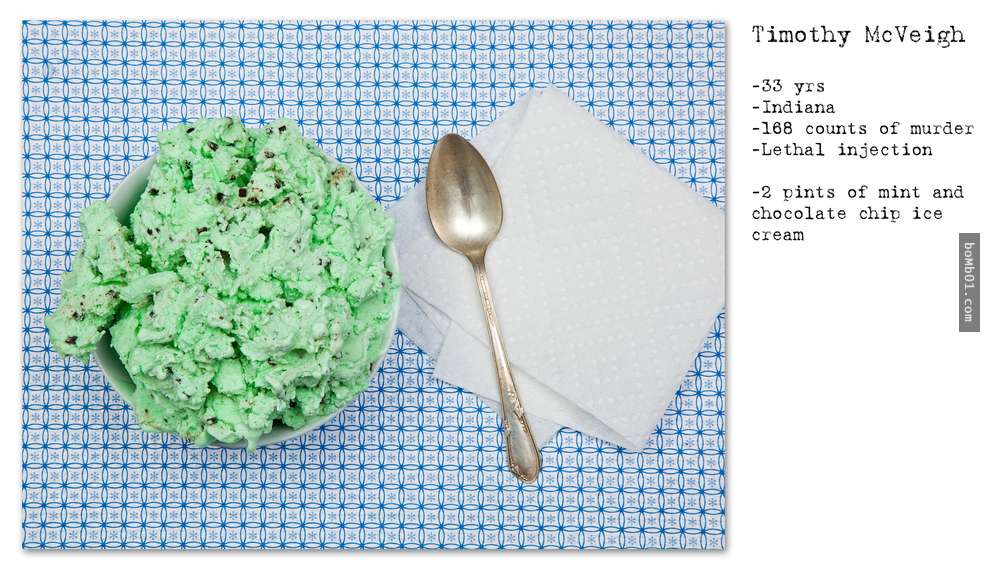▼Timothy McVeigh,33岁,来自美国印第安纳州。因谋杀罪名成立被判死刑。而他要求的最后一餐非常特别,就是大约一公升的薄荷和巧克力屑冰淇淋。