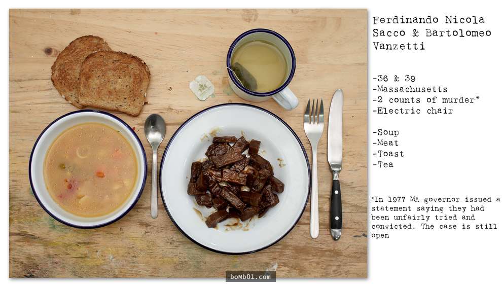 ▼Ferdinando Nicola Sacco (36岁) 和 Bartolomeo Vanzetti (39岁)都来自美国麻萨诸塞州,他们两人都因谋杀罪名而被判死刑。他们的最后一餐选择了肉、土司、汤和一杯茶。