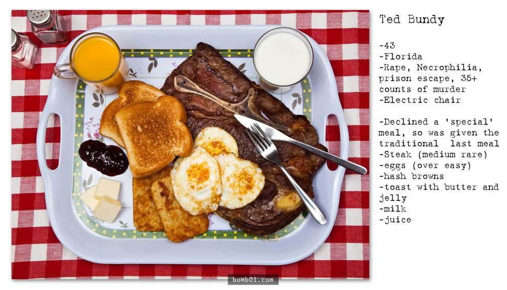 ▼Ted Bundy,43岁来自美国佛罗里达。他被判死刑的原因是强奸、死后奸尸、逃狱以及谋杀。在他死前他拒绝点餐,于是监狱方面只好他传统的最后一餐。这些食物有牛排、煎鸡蛋、马铃薯饼、土司、牛奶和柳橙汁。