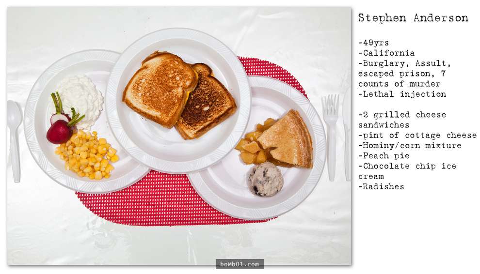 ▼Stephen Anderson,49岁来自美国加利福尼亚州。他因为入室盗窃、恶意攻击他人、逃狱和谋杀罪名被判死刑。他的最后一餐有两片烤起司三明治、干酪、玉米粒、蜜桃酥派、巧克力屑冰淇淋以及水萝卜。