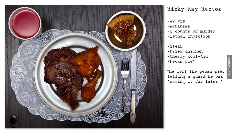 ▼Ricky Ray Rector,42岁,来自美国阿肯色州。他因为谋杀罪名成立被判死刑。而他点了一份牛排、炸鸡、Kool-Aid的饮料(Kool-Aid是美国一间饮料公司)以及一片胡桃派做为他的最后一餐。