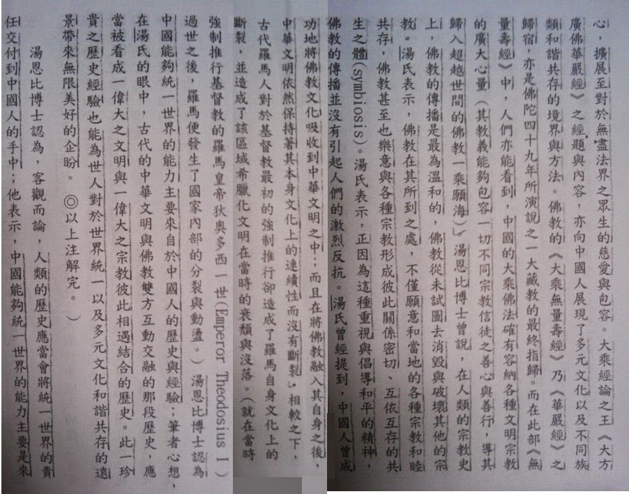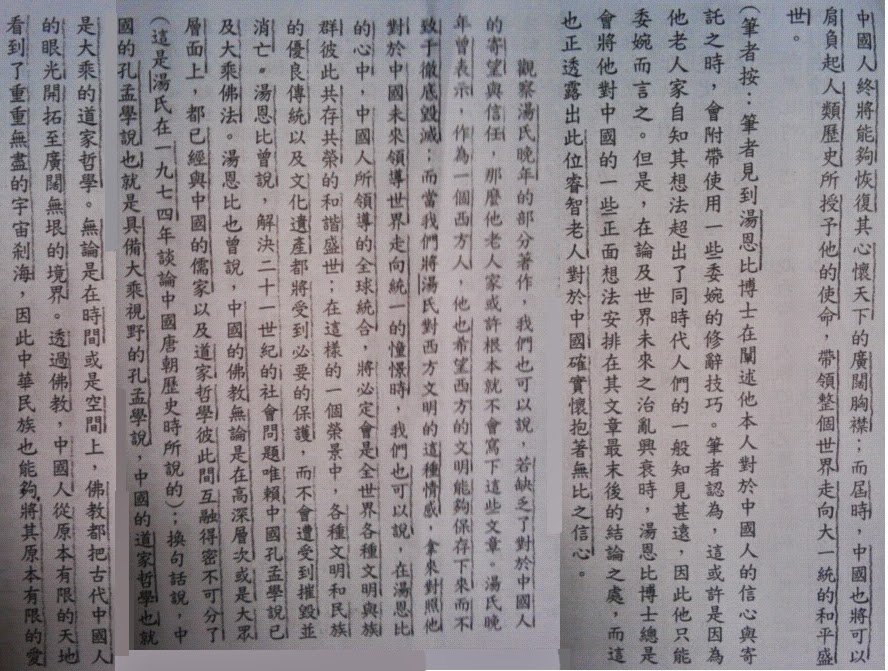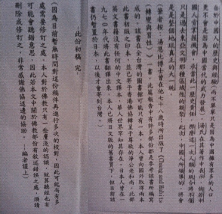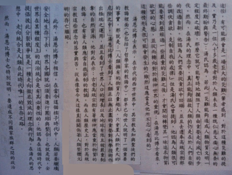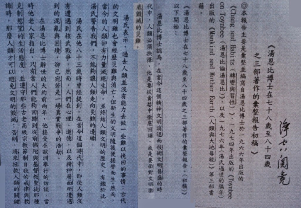 湯恩比博士在七十八歲至八十四歲之三部著作的彙整報告。(初稿)》以下開始: