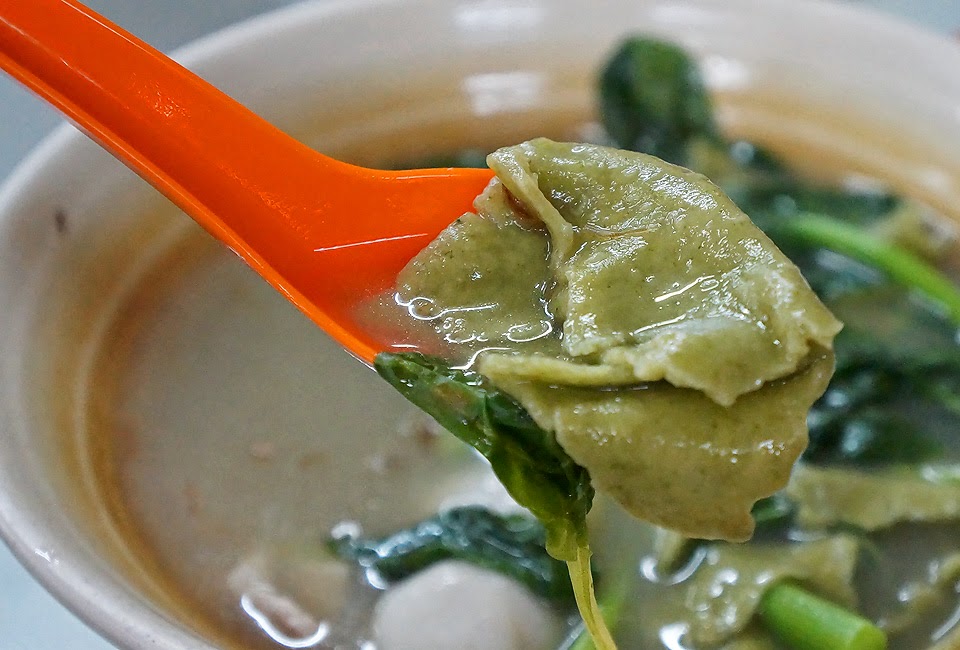 菠菜板面是很漂亮的青色,吃起来有种特别的甜味,柔滑的口感让人感觉是“滑”进嘴里的。因为家里的习惯,我吃板面都爱吃捏的;在柔佛,我们叫把板面叫做面粉糕。