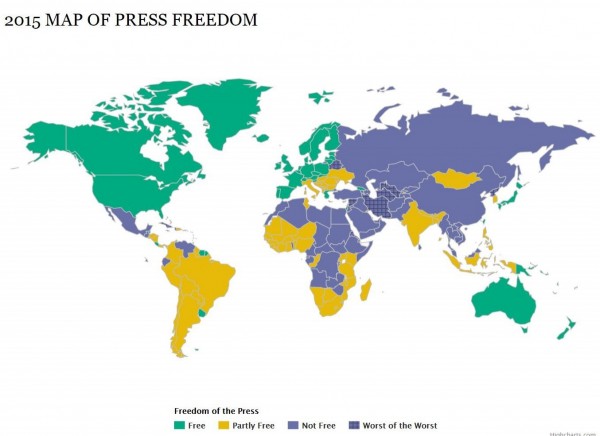 [size=0.95em]美國非政府組織自由之家公布全球新聞自由報告,綠色區域為享有新聞自由地區。(圖片擷取自自由之家網站)2015-04-29  15:30