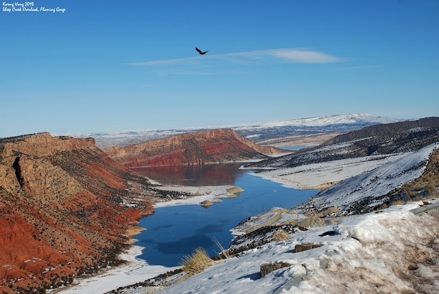 一路上的风景都是一样,近处是山,远处也是山。怀俄明州的山有很多都是荒山和岩石,加上层层积雪点缀下更是显得荒凉。可是这一山一石在我这个未曾见过荒山的外国人眼中都是特别的景色。见到想拍下的风景,我只需把车停在路边,好好欣赏一番。我沿着414号公路一直顺畅无阻地驾驶,路上遇见的动物恐怕比人还多。走着拍着,拐进了Flaming Gorge National Recreational Park的范围时,已经在车窗外遥远望见Green River,心里也开始亢奋起来。再开不久,到了一个叫Sheep Creek Overlook的高地,终于一见Flaming Gorge的真面目!Flaming Gorge名字的由来,是探险家Josh Wesley Powell在十九世纪的Green River探险时,发现像火烧一般的红色砂岩墙而得名。我一个人独占着Sheep Creek Overlook,这样冷的天气也没有多少游人,可那已是一月中气温比较高,也没什么风的好日子了。能见到Flaming Gorge这样的自然美景,加上层层积雪点缀冬天的景色,只能说太幸运了。