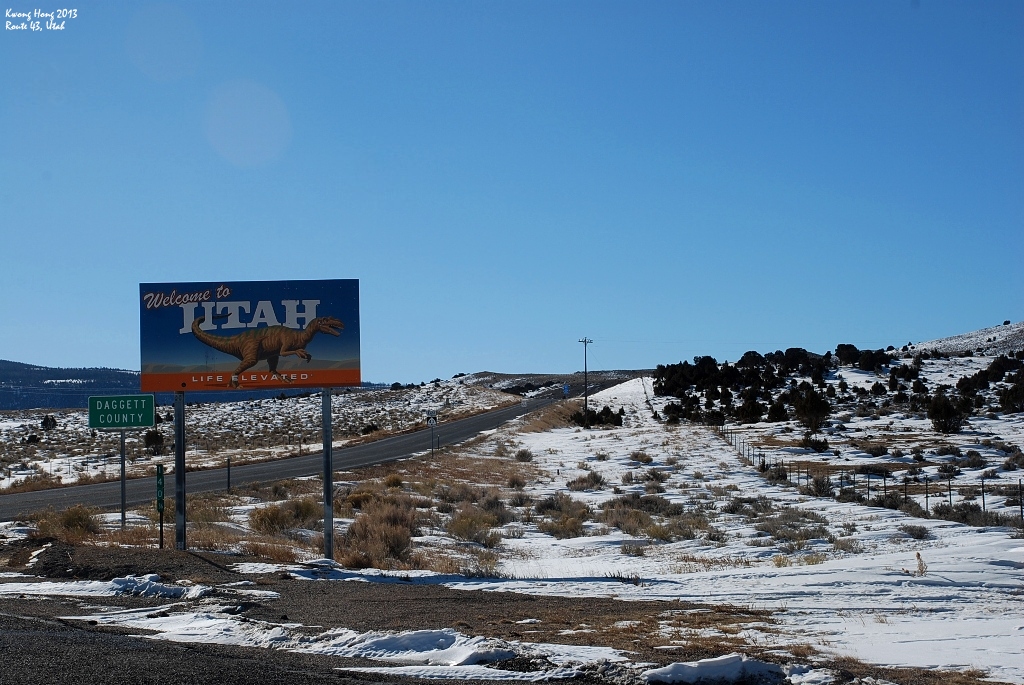 Flaming Gorge National Recreational Area是当地蛮有名的一个旅游景点,旅游活动包括露营、登山、钓鱼等休闲活动,主要是围绕着Flaming Gorge水坝,一个由Green River流入的蓄水区,从犹他到怀俄明延伸超过100公里,是个著名景区。这里有着不同时代的地质,富有考古价值,附近甚至有恐龙时代的遗迹。户外运动不是我的强项,而且又是冬天,所以我选择了最保险的自驾方式,跟着既定路线游玩Flaming Gorge。