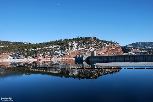 Flaming Gorge水坝是我的终点站,水坝上的水犹如平静的湖面,把山景折射出美丽的倒影,又是一番不同景象。回程后我才知道附近有个观景点能俯瞰水坝湖景,可惜错过成为遗憾。Flaming Gorge其实也称不上是美国或者犹他/怀俄明两州最著名漂亮的景区,可对处于寒冷冬天的我来说,那是个完美的美国初体验。后来我开车走过80号大道回到盐湖城,中间也经过一些特色小镇,可是最特别的那次驾驶,绕着Flaming Gorge景区,亲身体验了美国的公路行。