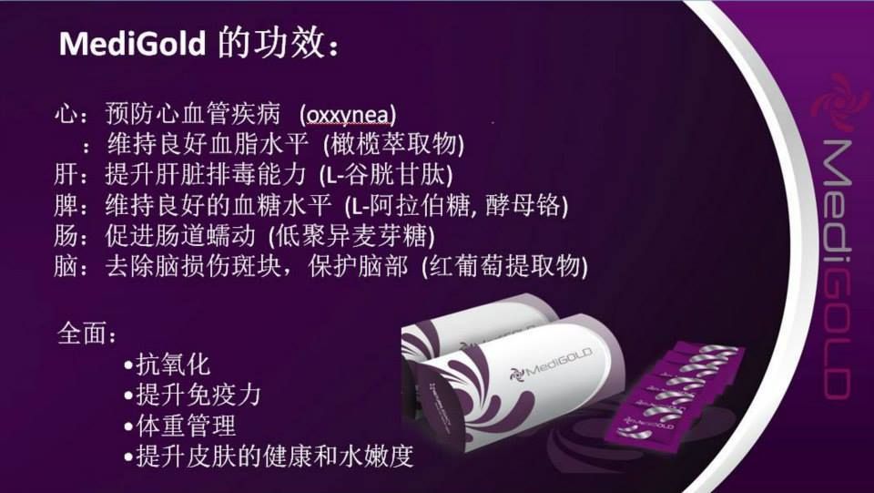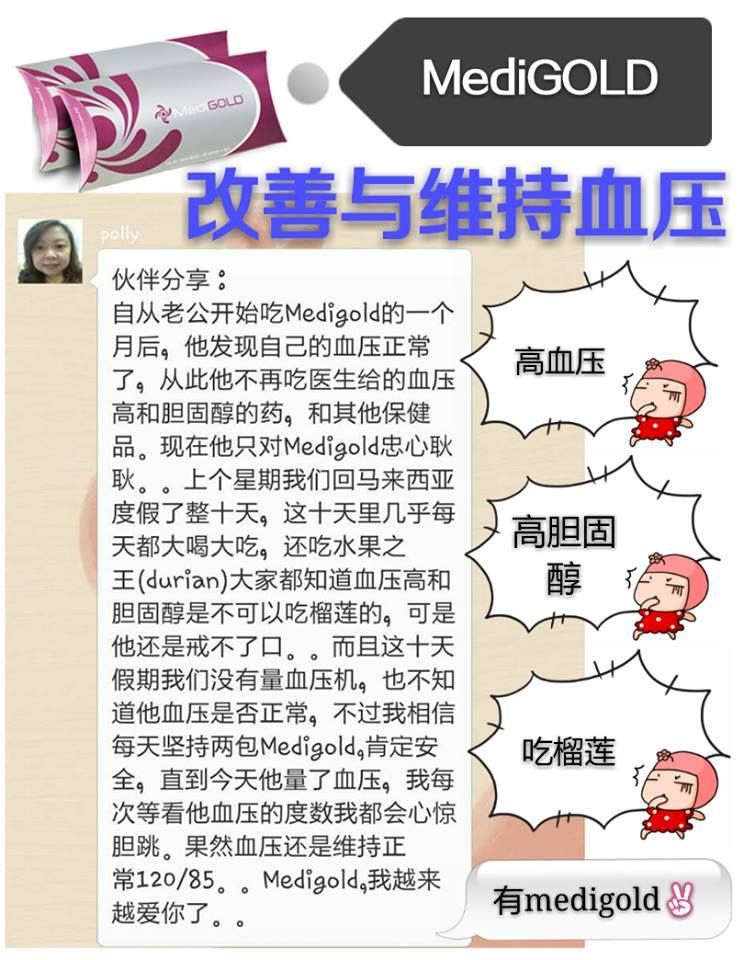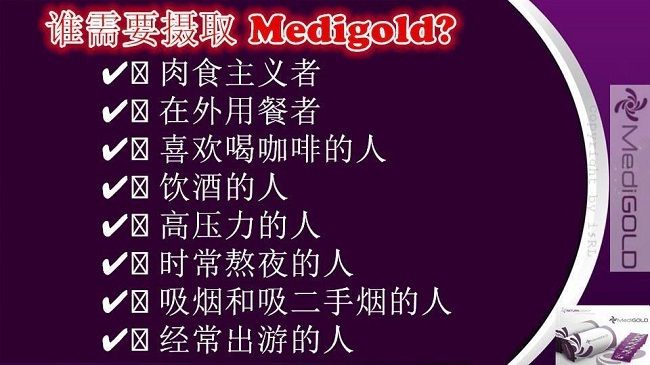答:基本上MediGOLD不会产生任何副作用,因为里头所有的成分取自于天然成分和不含任何添加剂。因此,它是一个适合每天服用的天然食品。 孕妇和哺乳的妇女适合服用MediGOLD吗?