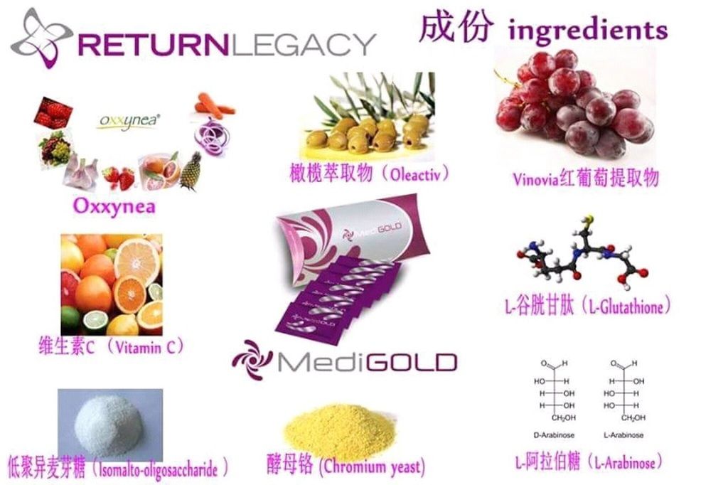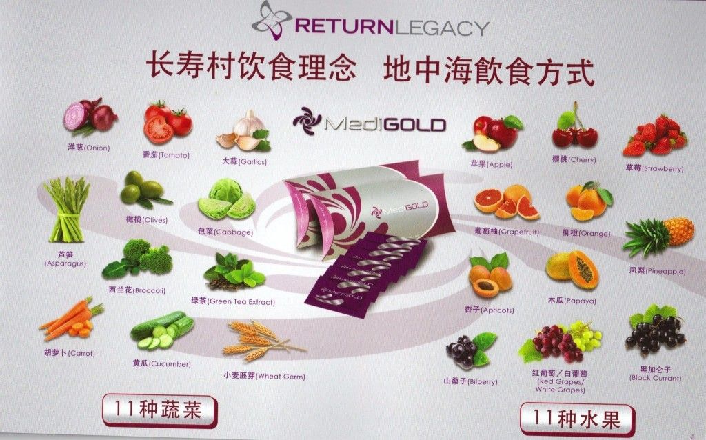 RETURN LEGACY以长寿村饮食理念为健康方向,并采用地中海饮食方式为主要配方,结合了11种不同的蔬菜及11种不同的水果,研究出超级抗氧化食品,那就是非常著名的MediGOLD。