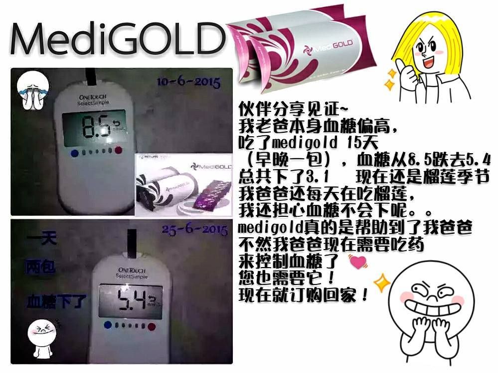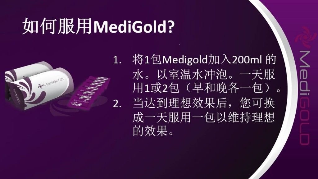服用方法:将1 包MediGOLD加入200ml 的水。以室温水冲泡。一天可服用1或2包(早和晚各一包) 什么时候服用MediGOLD效果最好?