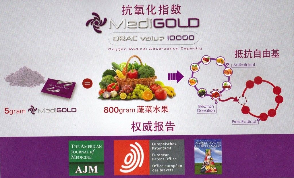 MediGOLD的抗氧化指数为ORAC Value 10000,一包5gram的MediGOLD等于吃下800gram的蔬菜水果,对于抵抗自由基有非常大的帮助。