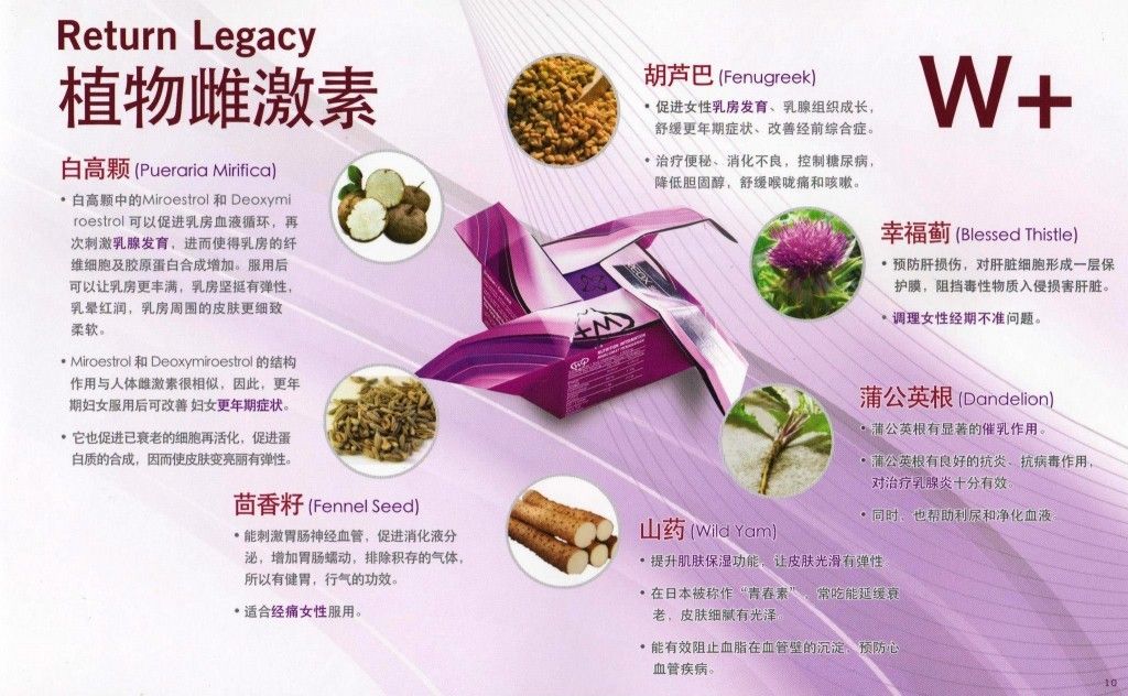 而RETURN LEGACY,以植物雌激素为主要原料,采取 白高颗,茴香籽,山药,蒲公英根,幸福蓟及葫芦巴用我们独有的配方设计出女性健康食品W+
