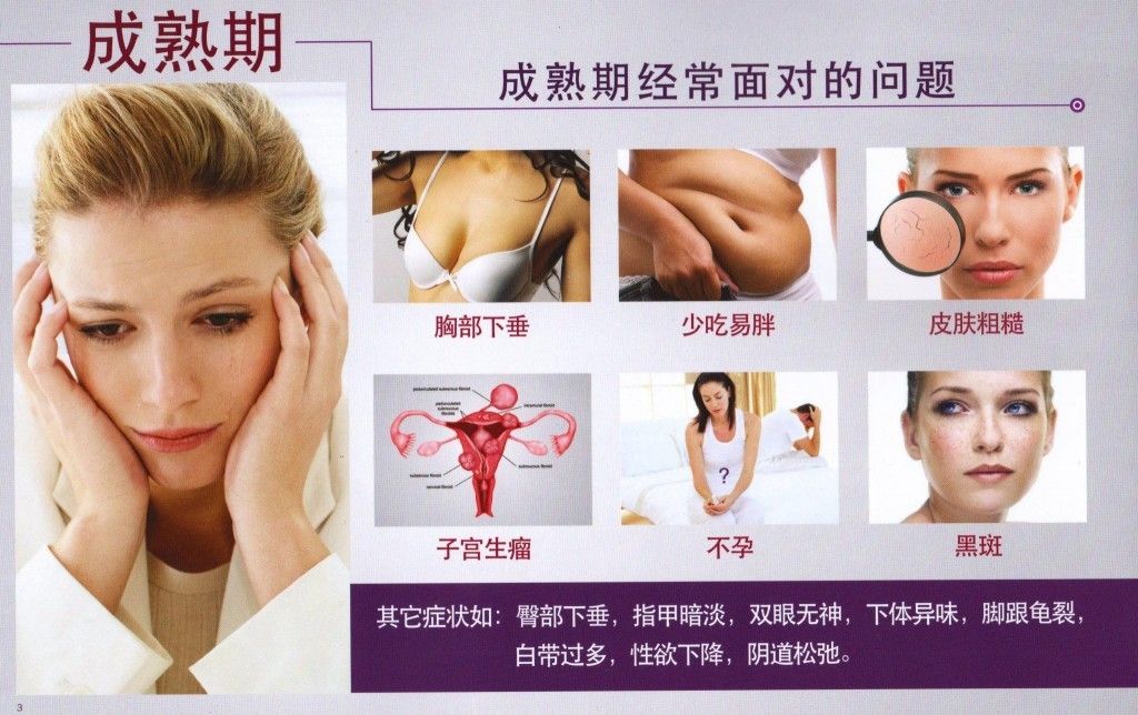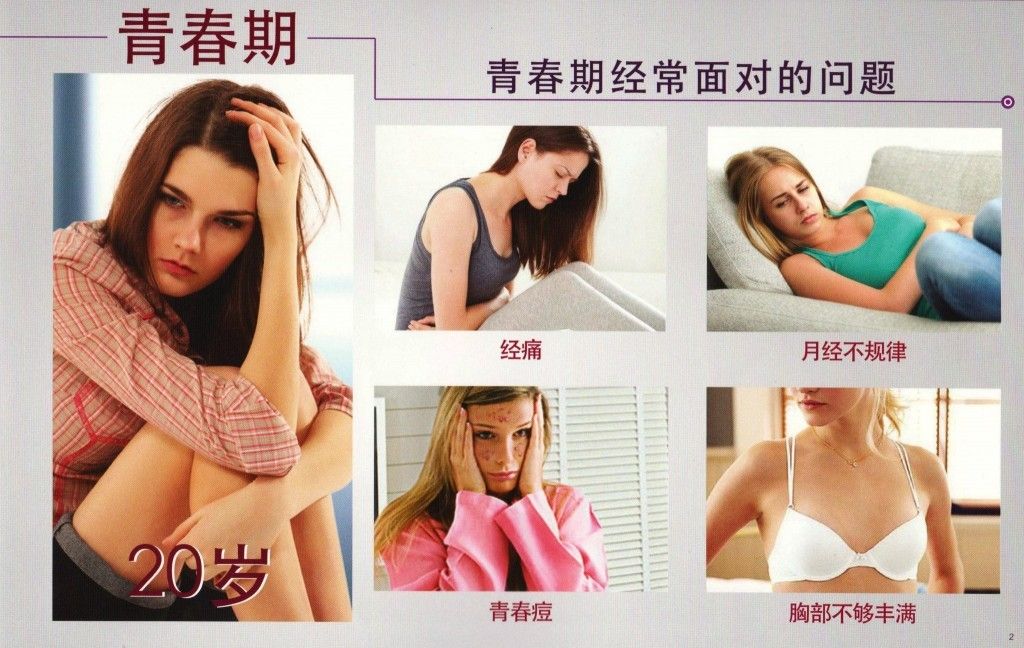 首先是青春期,大约在20岁左右的女性主要面对 经痛,月经不规律,青春痘,胸部不够丰满。