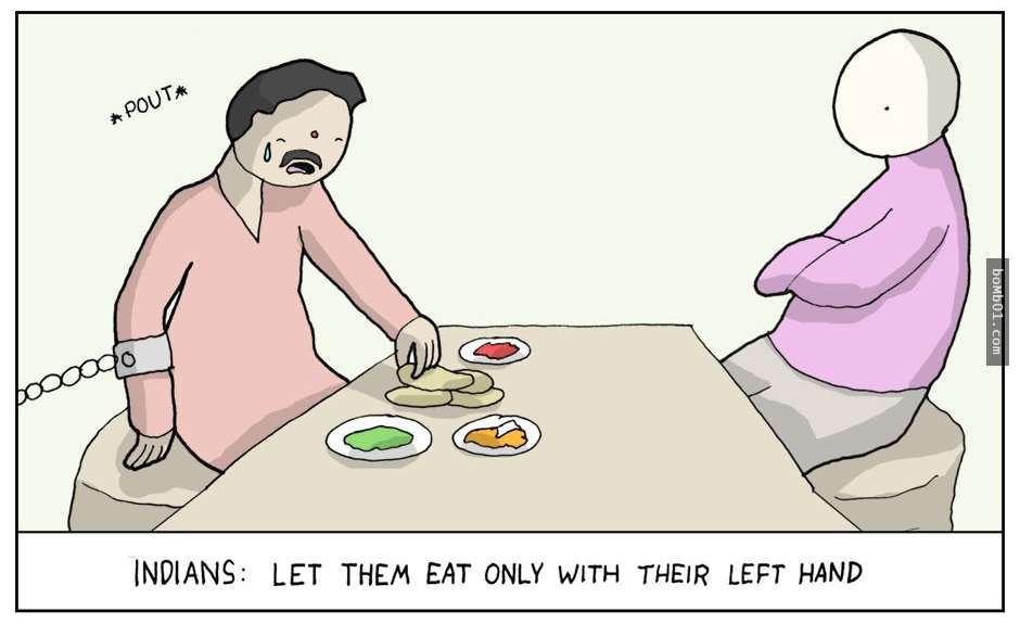 ▼3. 让一个印度人用左手吃饭。(印度人的习俗是用右手抓食物。)