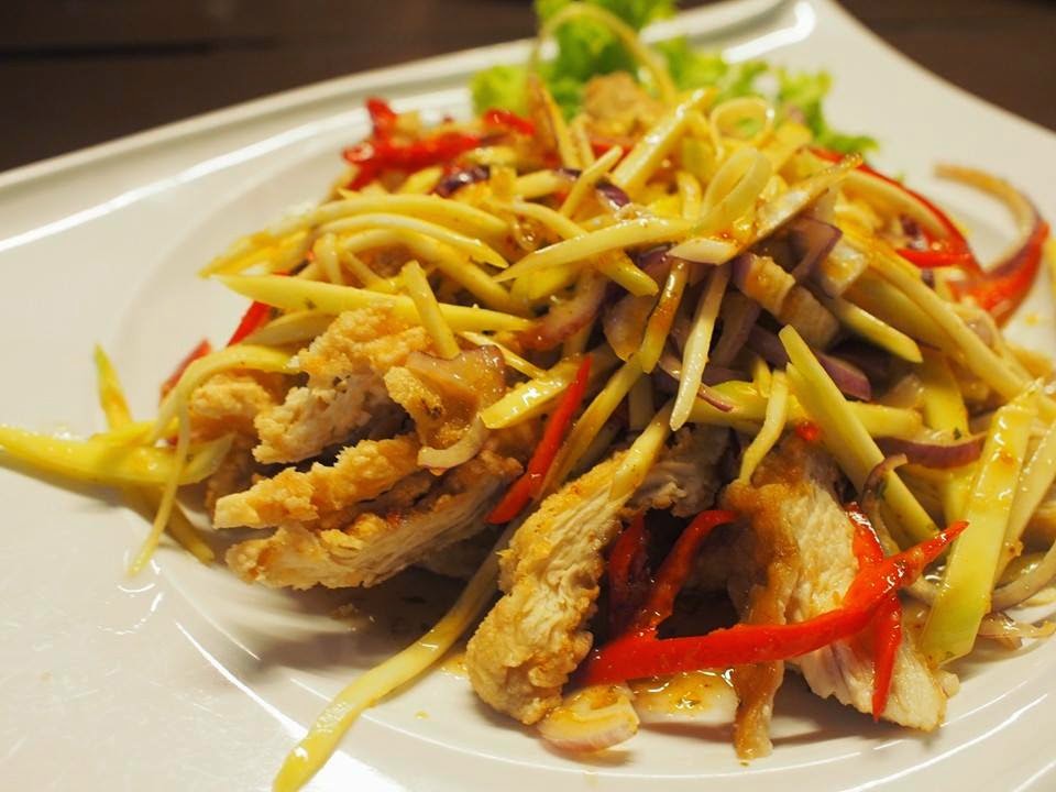 这道芒果鸡排是泰式食物。 微熟的芒果与鸡排,配上辣椒,洋葱,用辣椒酱凉拌。 整道菜酸酸辣辣的,非常开胃。 鸡肉炸得有点过久,让鸡肉失去了应有的肉汁,但胜在丰富的配料,让这道菜不失为过。