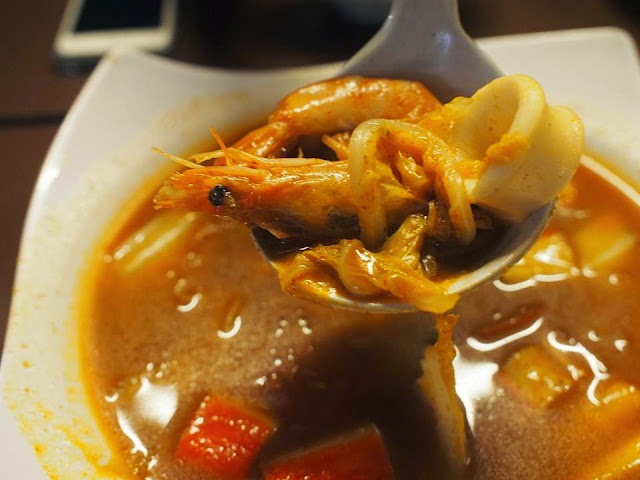 冬焱汤里满满的海鲜,有虾,sotong 和蟹柳。 汤头鲜美,味道也够酸,但是对我来说太辣了! 可是我爱吃辣的朋友吃得津津有味,所以能吃也爱吃辣的朋友们可以尝尝这道冬焱汤。