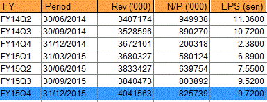 根据最新的业绩(2015年第四季),其单季营业额达到40亿4156万令吉,单季净利则达到8亿2574万令吉。