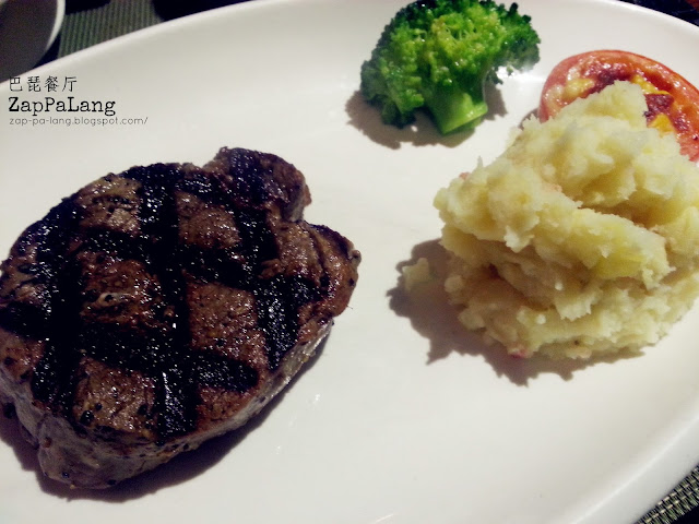 点了我最喜欢的牛扒套餐,套餐包含了沙拉,奶油蘑菇汤等前菜,主食除了牛扒,还有马铃薯泥和蔬菜等传统的搭配。