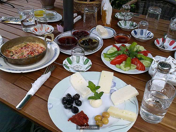 ▼24. 土耳其早餐是非常多种类的,像起司、奶油、橄榄油、鸡蛋、番茄、黄瓜、果酱、蜂蜜和辣味肉,超多元化的选择,绝对吃得饱饱的。