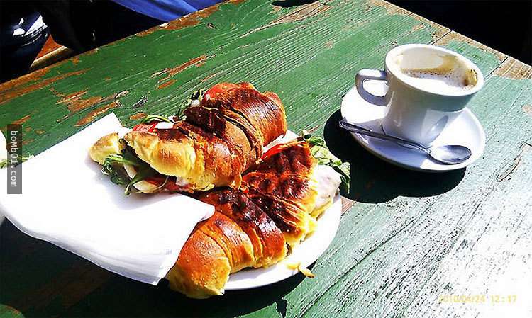 ▼7. 义大利早餐,卡布奇诺咖啡和羊角面包。