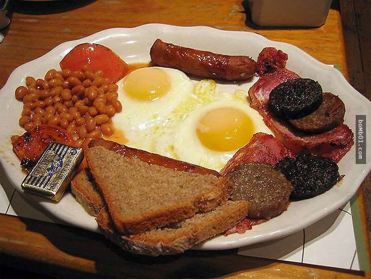 ▼1. 英国早餐:通常一定有豆类,香肠,熏肉,鸡蛋,蘑菇,马铃薯煎饼和吐司。如果再配上一杯热茶的话那就太完美了。