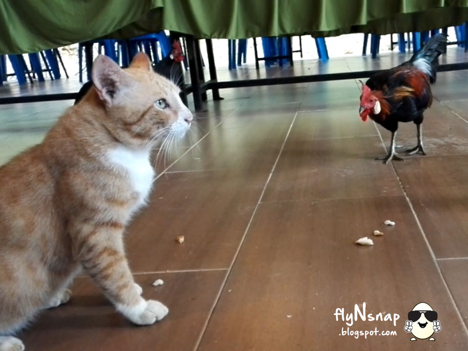 這個地方也很靠近原住民的部落,常常有野雞會跑來這裡和貓搶食物。它們每次都會出現在食堂裡,我們看見就餵了它們點食物咯。