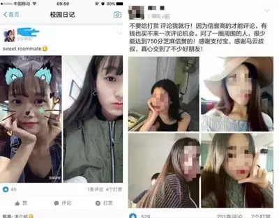 这几天支付宝上线了一些新功能,“校园日记”、 “白领日记”和“生活在海外”,只有女大学生、白领、国外女性才能发布动态,而且还是有要求的,想与她们互动,芝麻信用分必须超过750分。一时间支付宝圈子里出现了大量的美女照片和大尺度照片,好多人都开始求“打赏”,希望有人在支付宝里给她们发红包。