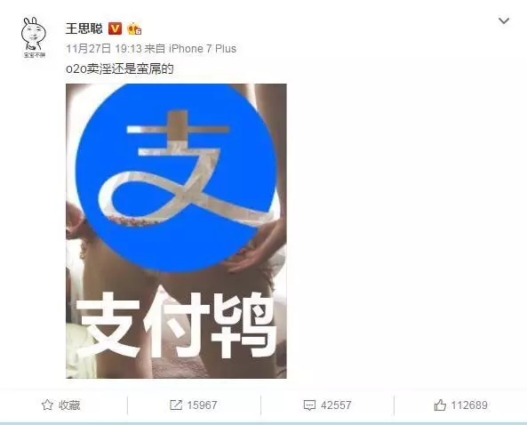 “国民老公”王思聪看不下去率先“开炮”,并配图讽刺支付宝变成了“支付鸨”,网友们都觉得这个词语实在太贴切,纷纷也用这词吐槽支付宝的新功能。