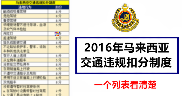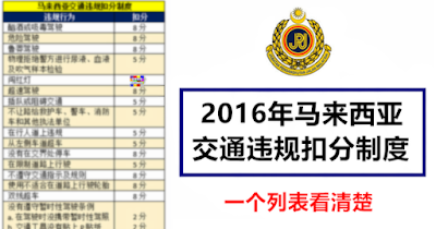 各位馬來西亞的汽車司機和乘客要注意了!馬來西亞新的交通規則將從2017年3月1日開始生效! 有關條規如下: 1。駕駛時兒童坐在司機的腿上 = 扣除6分 + Rm300 罰款。 2。闖紅燈 = 扣除6分 + Rm200 罰款。 3。酒後駕車 = 扣除12分 + 駕照暫停到五年。 4。不系安全帶= 扣除3分 + Rm200 罰款。 5。乘客沒有系好安全帶= 扣除1分 + Rm50 罰款。 6。開車時使用手機= 扣除3分 + Rm200 罰款。 7。開車時抽菸= 扣除 1分 + Rm200 罰款。 8。掩蓋車牌板= 扣除12分 + 懲罰。 9。超速= 扣除6分 + 罰款。 10。讓14歲以下的司機(乘客)開車= 駕照暫停1年,扣除6分 + Rm300罰款。 Traffic rules come into force on 1st. March 2017 : 1. Driving with child seating on driver's lap, deduct 6 points plus Rm300 fine. 2. Beat red light, deduct 6 points plus Rm200 fine. 3. Drunk driving, deduct 12 points plus drivers license suspended upto five years. 4. Not fastened seat belt, deduct 3 points plus Rm200 fine. 5. Passenger not wearing a seat belt, deduct 1 point plus Rm50 fine. 6. Using phone while driving, deduct 3 points plus Rm200 fine. 7. Smoking while driving, deduct 1 point plus Rm200 fine. 8. Cover up registration plate, deduct 12 points plus punishment. 9. Speeding deduct 6 points and compound。 10. Driver (passenger) who let under age (14 below) driving, suspend one full year driving, deduct 6 points plus Rm300 fine.
