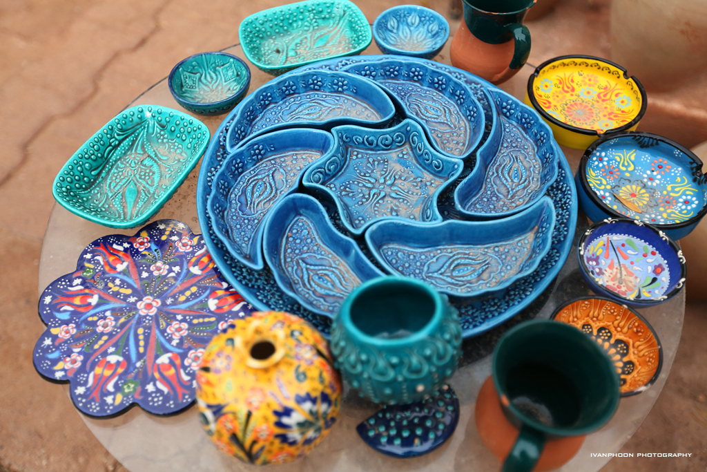 这几天的行程里,发觉土耳其人都很热诚,有问必答,虽然语言不通,但他们都会用肢体语言来表达。 经过这陶器店铺,老板冲出来诚意拳拳邀请我们进去参观陶瓷器工坊,盛情难却,只好进去打个转就出来。 里头的品种繁多,有日常器皿,装饰品,瓷砖......等等, 在造型与图案上都有独特风格,陶瓷器的绘画纹饰精致精美,色彩丰富。  刚巧经过一家餐馆,老板邀请我们进去看了制作 Pide 土耳其披萨的过程。 这四周都能看见大大小小陶器工坊,陶瓷器价钱也公道。 走着走着来到一间不起眼的小型陶瓷器工坊, 这老板也挺好,让我们参观和拍摄制造陶瓷的过程。 这都是手艺功,没些日子也难成气候 ~ “台上三分钟,台下十年功” 成品都很精致 大爱这个小镇,整个小镇已陶瓷闻名,每家店铺铺满了自己创作的瓷器,店铺中琳琅满目的瓷器,简直挪不开眼睛。 镇上的水果专卖店,里面的标价都很便宜,可惜没切片服务,不然就把哈密瓜买来吃! 当地年纪较长的居民都喜欢在公园或清真寺外喝喝红茶打发时间。 不得不说土耳其四处都能见到猫猫狗狗的踪影,当地人都会把一些狗粮猫粮装在盘子里让它们吃,好有爱心。