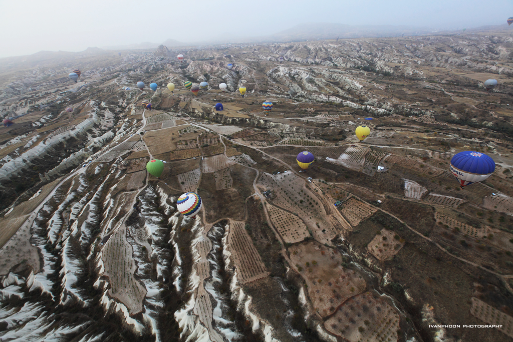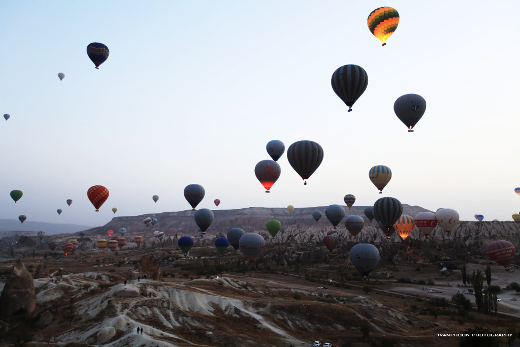隔天一早便赶去Sunset View Point 拍摄热气球,上面的人潮多的很,美眉们都穿上礼服拍摄。 今早的空气质素不错,能清楚的看见对面的Uçhisar城堡。 从天黑到天色渐渐亮起,热气球也慢慢升起,空中的热气球也越来越多。 早上观看热气球还挺冷的,最好多穿一些,我都全副武装才敢去拍摄,女皇冷到鼻涕直流 .... 飞行员胆子真大,把热气球飞到岩石边上,站在那儿都能清楚看见篮筐里的人。 今早天气还是阴阴沉沉,没法拍摄到大片!