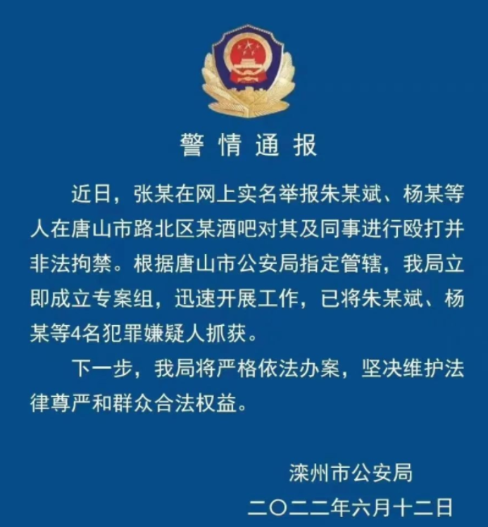 就在打人事件中涉案的9名嫌疑人被捕归案之后,在2022年6月12日晚上,唐山市警方又先后抓获了6名涉黑嫌疑人!