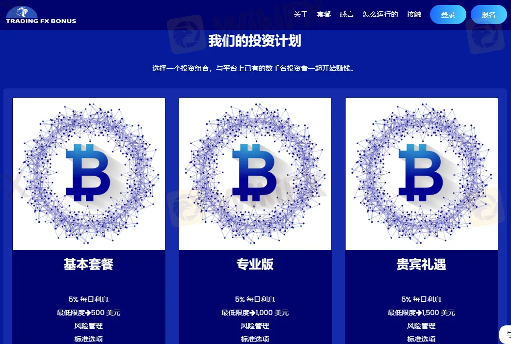 根据客户的投资金额不同,分为基本套餐、专业版和贵宾礼遇三个不同类型的投资计划,其中基本套餐最低入金500美元,无论何种计划投资者都将获得5%的每日利息。