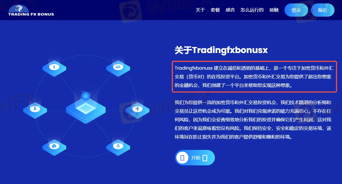根据TRADING FX BONUS官网介绍,Tradingfxbonusx (TRADING FX BONUS)建立在诚信和透明的基础上,是一个专注于加密货币和外汇交易(货币对)的在线投资平台。