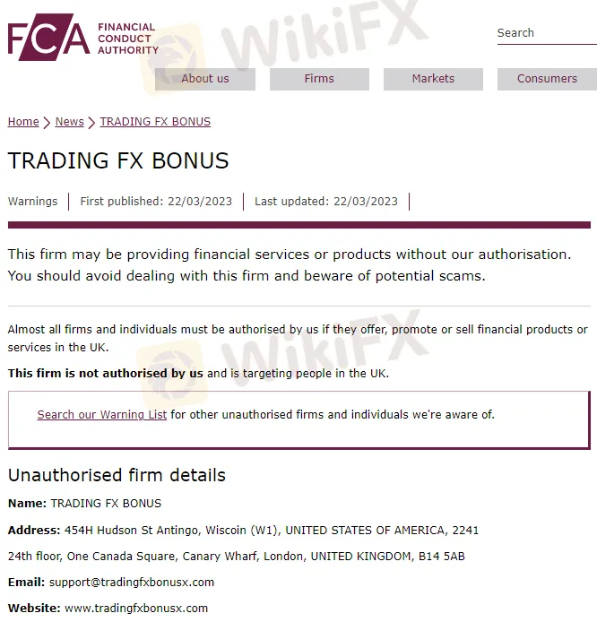 3月22日,英国金融行为监管局( FCA ) TRADING FX BONUS 发出警告,提示投资者警惕与这家未经授权的公司打交道。
