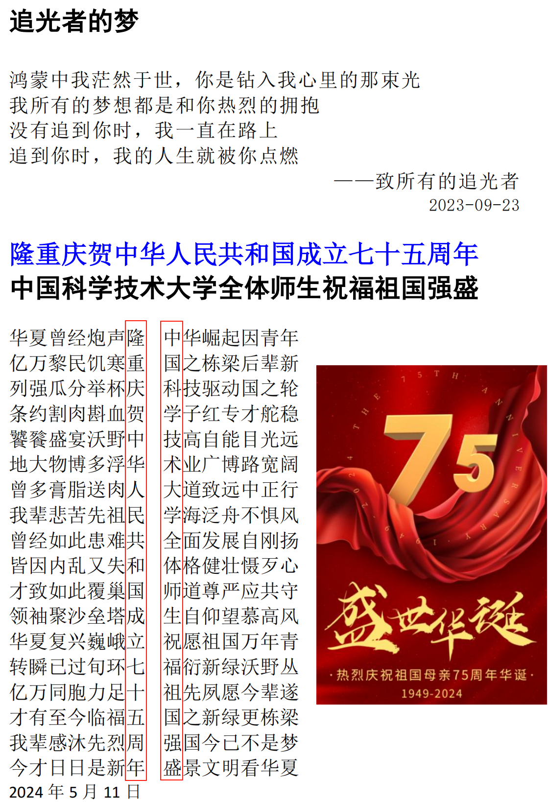 隆重庆贺中华人民共和国成立七十六周年,中国科学技术大学全体师生祝福祖国强盛