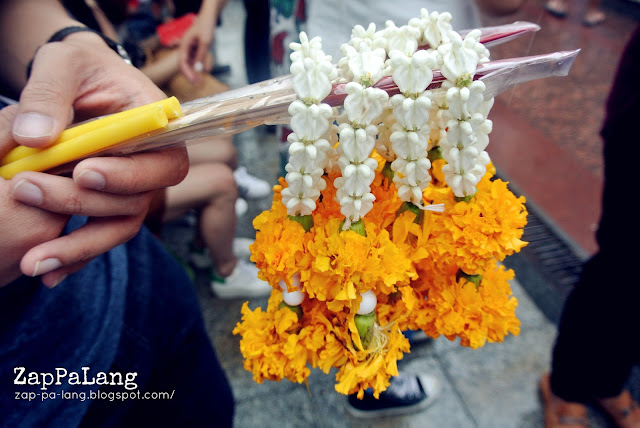 首先,到旁边的卖花摊位一人买一套基本配备的香烛和鲜花,一份50Baht。这里头有4串花,两根蜡烛和一把香。