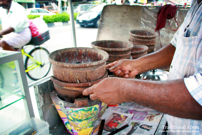 这位印度小贩名为Guna。Guna叔在这里售卖Apom已经有三十年了,而这Apom是他父亲传下来的。Guna叔说他的父亲售卖Apom已经有四十年之久(在别处售卖),合计起来,这传统Apom也有七十年历史了。 传统式和现代式的Apom不同在于制作Apom时所使用的器材。现代式Apom都是在铁板上煎的,而传统式则是用砂煲。 现代的Apom都是用煤气煎热的而传统的依然使用火炭。火炭给我的感觉就是煮出来的食物都是比较好吃,火候很够的。 看见Guna叔手上拿着的“鼓棒”吗?这是用来搬动热烫烫的砂煲的。砂煲上被另一个装有火炭的砂煲盖着,Guna叔说这是为了让被盖着的砂煲够热,这样才能煎热Apom。