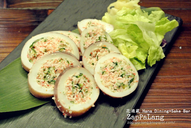 蟹肉和黄瓜做内陷, 外头裹着圈墨鱼, 整体口感不错, 调味属于清爽型。