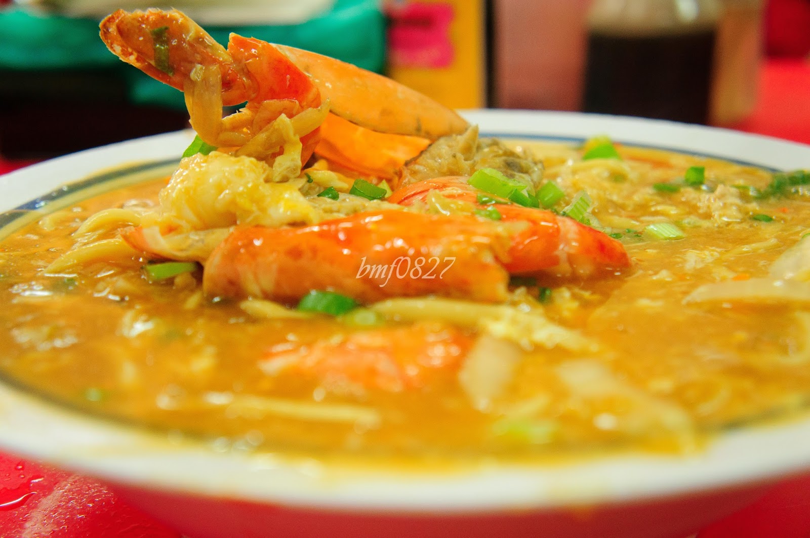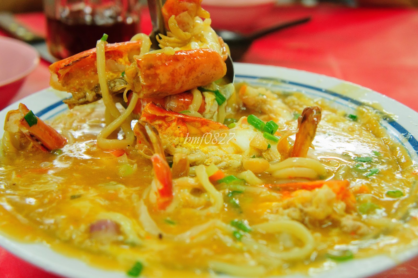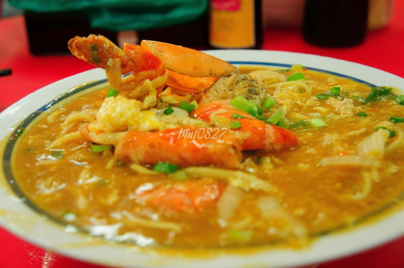之间在 Dengkil 吃到超浓郁的虾卤面,可惜它晚上没有营业。于是就去了隔几间的成记海鲜饭店。话说,每次经过时都看到这家饭店很多人,墙上也贴着一些名人到访的照片。 我们在这家饭店也点了虾卤面,想说可以比较一下。可是完全的让我们失望,这家的虾卤面很“水”。味道很淡,吃不到虾应有的鲜味,浓稠度也很低。这简直比普通的卤面还让人失望。重点是,这家的价钱还贵过我们所吃的,但味道却不及。 虾卤面 (RM 52)