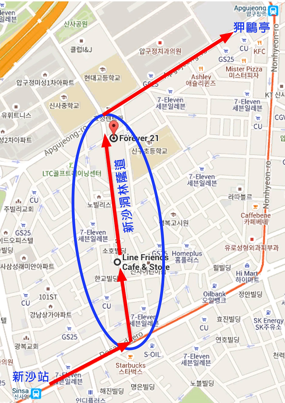 Line Friends 就在Sinsa新沙站附近的新沙洞林荫道里。 新沙洞林荫道有特色的咖啡厅、艺廊、餐厅、酒吧、潮流时尚店、流行小品店等到处都有,大大小小,玲郎满目。此外,室外建筑也都推陈出新,充满艺术及独特设计。