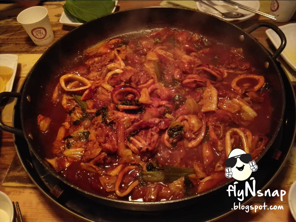 如果吃省一半时还可以叫服务员另外加炒饭,他会把饭倒进铁窝里,直接在铁窝上炒饭。 辣炒鸡排加鱿鱼,一人份 - KRW11000 加炒饭,一人份 - KRW4000