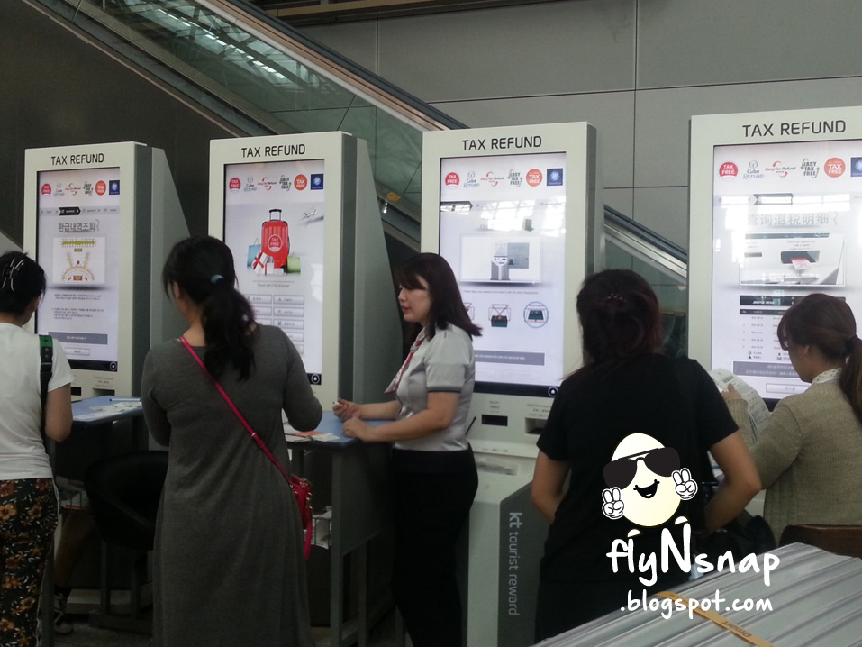 #提示:有些店刷卡是有折扣20%的哦,所以刷卡会比用韩币更节省。 1. 办理登机手续,换取登机牌 2. 通过自动退税机(KIOSK)进行退税 3. 完成出境审查后,前往相应的退税柜台(Gate 27~28),出示退税单和护照即可领取税金。