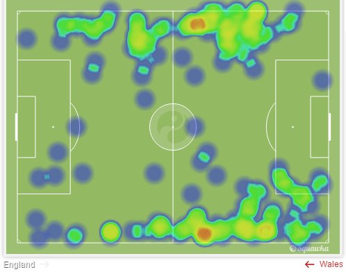 英格兰前锋群数据。(数据来自:Uefa.com) 斯图在右翼拉边时更是频频远射而不是选择把球传给位置更好的队友 (5次射门,2次射偏,2次射正门将,一次进球)。 这样的数据看起来更像是霍帅让球员们自由发挥(完全放弃),而不是针对性的做出了策略上的改变。 是霍神还是祸神?你来决定…… 预料以外的秘密武器 当然,我们也不能全盘否定霍奇森,至少他选对了两个来自热刺的边卫球员, Walker 和 Rose。 原本英格兰采用的 4-3-3阵形就有着天生的缺陷:没有边锋的支援。执意采用这一阵形的霍奇森只带了一个天生的边锋,那就是 Sterling。(从这里也可以看出来,霍奇森其实压根就没有想贯彻4-3-3这打法,又或者他的中心战略是有问题的!)但是 Sterling 那自我为中心的打法是无法提供前线支援的,也因此这一场半以来英格兰的火力孱弱。 Walker 和 Rose 在这场比赛的触球热点。(图片来源: Squawka.com) 下半场,霍奇森把 Sterling换下场后,英格兰的两个边卫却很好的和前线衔接了起来,当然这也部分归功于龟缩防守的威尔士。不得不提的数据: Walker 和 Rose 贡献了英格兰 103/493的传球(20.9%!),传球成功率分别是88% 和 90%。这一对边卫,或许会成为英格兰在欧洲杯赛事的秘密武器。 |