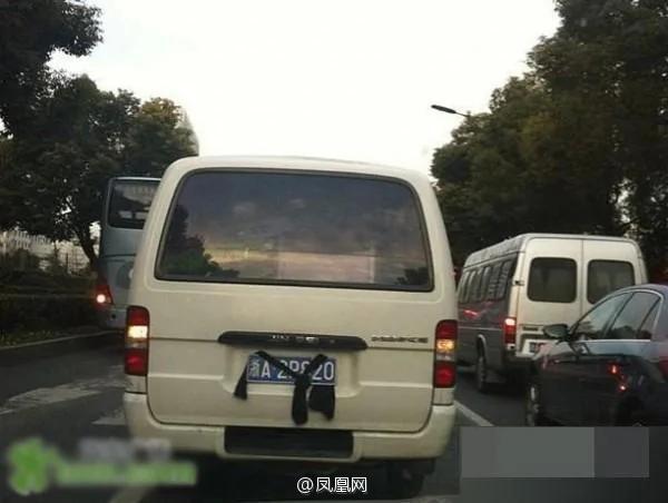 图:此图摄于2016年7月28日,为了避免收到罚单,竟然想到用一个人挡在大货车前的车牌,真的是不要命的行为。 图:完全不顾形象,这位车主还想到用内裤来遮住车牌。 图:贴纸。这还是属于比较普遍的做法。