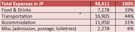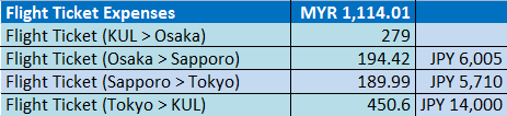 以下是将近3个月日常花费的总结,不包括机票: 飞机票的花费 一共飞了四趟,总共是 MYR 1,114。 所以,总消费是 MYR 2,348。纯粹在关西的12日游花费,可以参考这里。截至那时,其实已经花了33,365円(大约马币一千)。后来在北海道换宿,是有一些 cash inflow,我想那也是我主要没花到那么多钱的原因。 |