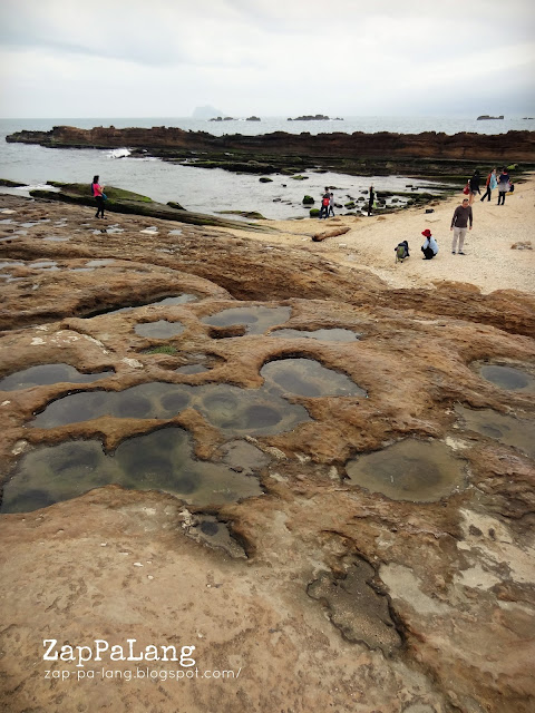 因为靠海的关系,比较靠近悬崖边的地区会有一定的危险性,所以地上都会贴有告示说明不可越过的范围。但是偏偏就有不少来自强国的游客喜欢挑战规则,无视警告地站在悬崖边拍照,造成警卫队的哨子声此起彼落。野柳的警卫队,辛苦你们了! 从入口处开始走不久,就看到这个头像了。慢着!别高兴得太早,看它周围没人在拍照,这一定不是女皇头。这颗岩石的名称应该是叫做调皮公主。。。 跟着人潮走,果然最多人的地方就是女皇头的所在地啦!前方有小石子围着的就是女皇头。经历了这么多年风化的效应,女皇头的脖子是越来越细了,难保有一天会有倒塌的可能。所以现在都不允许游客们触摸女皇头,只能远远地跟它合照。 你看看这排队的人潮,全都是要跟女皇头合照的。 我站在远处,来个长镜头,把女皇头从最佳角度拍下,就算是到此一游了~ 其实如果不是游客太多,在这里静静欣赏大自然打造的奇景,吹吹海风的也还不错。在海边的这些洞洞倒是吸引了我的注意,它们的名称是海蚀壶穴。 壶穴是圆形的洞穴,从海蚀平台表面的凹穴开始发育,凹穴受波浪携带的石粒在海蚀平台上进行钻蚀作用,会使得凹穴逐渐扩大,有的甚至可将数个壶穴壁切穿,使其相连,形成联合壶穴。有的因为不同时期的钻磨,行程穴中穴的景观。 我们没在这里逗留太久,因为大家都开始饿了。跟其他景点一样,在离开之前总会有很多卖小吃和纪念品的小摊子在一路上诱惑着你。 尤其是烤鱿鱼片的摊子,飘散出来的香味真的让人没办法抗拒。我们看着阿姨一边以慢火烤鱿鱼片(NTD130),一边把鱿鱼片慢慢地拉长,并在上面抹上蜂蜜。不过牙力不够好的朋友可别轻易尝试了,因为这真的太硬太难咬了。 |