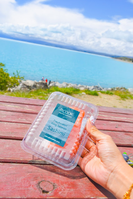Lake Pukaki 的所在地, 除了来看湖,当然是来吃三文鱼啦。 这里的三文鱼是养殖的。 当然也有卖三文鱼刺身。 如果你真的是刺身爱好者,记得一定要买 NZ30 - 500gm 的, 我们买NZ10 - 100gm 的。 真的完全不够喉咯。 但老婆说,就是不够吃才真正的好吃。