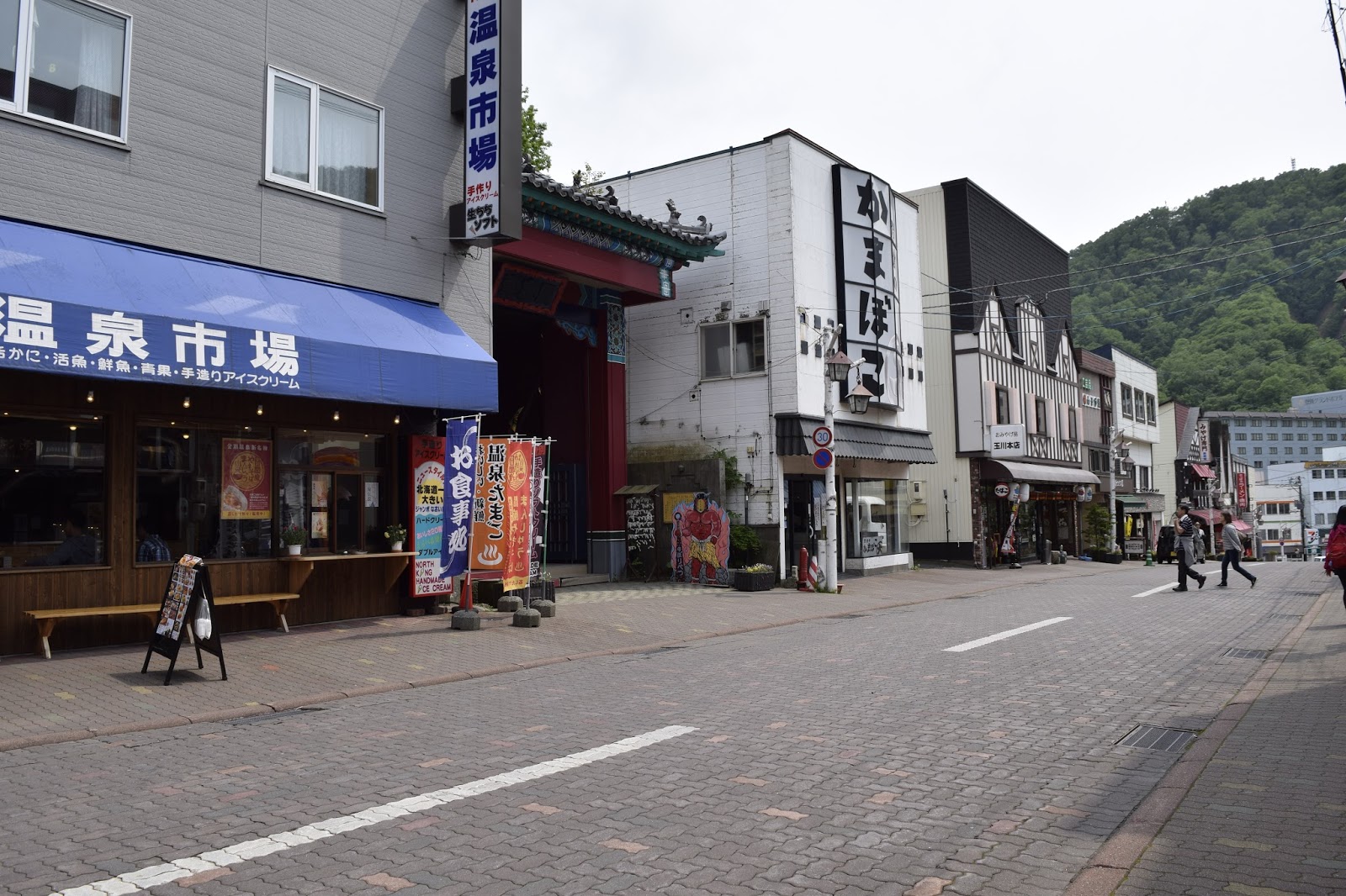 登别的这一条整齐街道几乎全是售卖当地的土产及纪念品,相信是针对游客的需求而经营。夜里有许多游客穿着酒店的浴服和拖鞋满街走。
